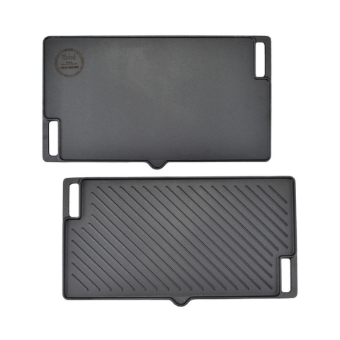 Grillező lap, kétoldali 45 x 25 cmA lap sima és rácsos részből áll, így mindkét oldala használható. A sima oldala zöldségek és köretek sütéséhez használatos, a rácsos oldala pedig hús és hal grillezéséhez. Alkalmas gáztűzhelyhez, sütőhöz, valamint nyílt lánghoz is. Öntvényből készült, ami egyenletesen melegszik fel és hosszan megtartaj a hőt. A lap széle megakadályozza az olaj lefolyását. Ajánlatos neutrális folyékony tisztítószerreltisztítani, sz