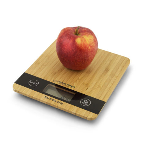 Konyhai mérleg BAMBOOKonyhai mérleg természetes bambuszból. Rendkívül pontos, nagyon vékony, divatos kialakítással és nagy kijelzővel. Minden száraz és folyékony összetevő mérésére alkalmas. Pontos mérőérzékelővel ellátva.Technikai paraméterek:Maximális mérhető súly: 5 kgPontosság: 1gMértékegységek: g / lb / ozTare funkcióTúlterhelésjelzőAkku lemerülés-jelzőMérőterület méretei: 21,8 x 18,8 cmÁramellátás: 3 elem AAA (nem része a csomagolásnak)