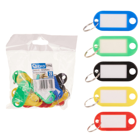 Kulcstartó készlet - címkék 20dbKulcstartó készlet 20 darabos kiszerelésben.Technikai paraméterek:A csomagban 5 különböző színű címke található : zöld, fekete, piros, sárga és kék