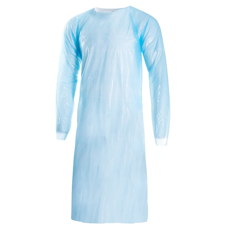 Erős CPE polietilénből készült hosszú ujjú kötény, mérete 120x90 cm, hüvelykujj lyukkal, hogy megakadályozza az ujj elcsúszását. Alkalmazás: élelmiszer-, orvosi-, vendéglátó- és egyéb iparágakban, a ruházat szennyeződések és folyadékok elleni védelmére. K