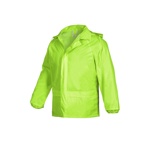 REGEN könnyű esőkabát Anyaga: 100% poliészter, PVC bevonattal, 180 g/m² anyagsűrűséggel. Elülső záródása rejtett patentos szegéllyel fedett cipzárral történik. Kapucnija zsinórral állítható, és a gallérban elrejthető. Két alsó zseb hajtókával ellátva. A b