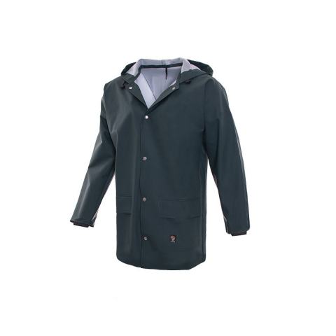 Vízálló kabát Probaltic anyagból (poliészter kötött anyag polivinil-klorid bevonattal), 350 g/m2 felületi tömeggel - alacsony hőmérsékleten (-50 C fokig) hajlításnak ellenáll. Egyszerű kialakítású és combhosszú kabát. Rozsdamentes acél gombokkal rögzítve