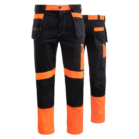 PROMONTER nadrág Fekete HV elemekkel. Szakadás- és kopásálló Twill anyagból készült nadrág, 65% poliészter és 35% pamut anyagból, 260g/m2 tömegű. A térdrészen OXFORD anyagból készült megerősítések védik a kopást. Lehetőség térdvédő használatára. Nagyszámú