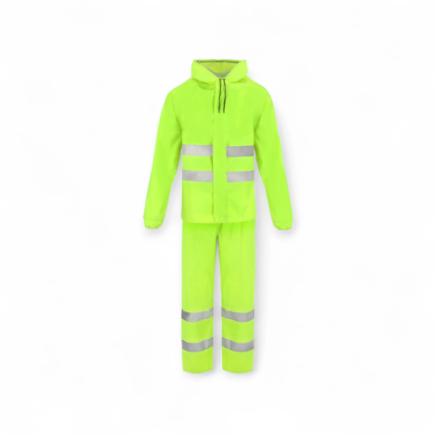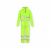 Jólláthatósági RAINVIS esőruha vízálló anyagból, fényvisszaverő csíkokkal készült, mely nehéz időjárási körülmények között is jó láthatóságot biztosít. A készlet egy kabátból és egy deréknadrágból áll. A kabát cipzáras, amelyet pattintható hajtóka fed, ka