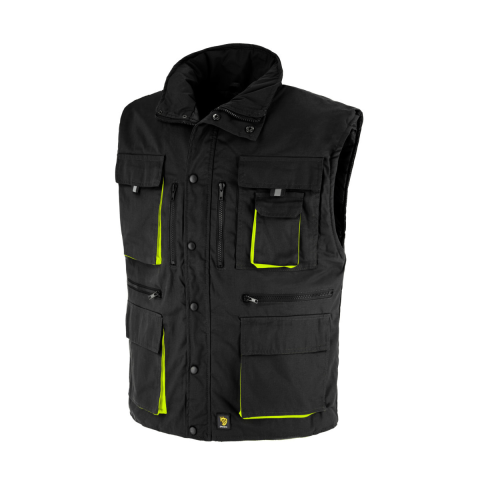 Hőszigetelt mellény 65% poliészter, 35% pamut külső anyagból. Meleg belső szigetelés, belül steppelt béléssel. Cipzáros záródás, csappantyúval rögzített hajtóka borítja. A magas állógallér, a mellény meghosszabbított hátulja és a karok körüli mandzsetták