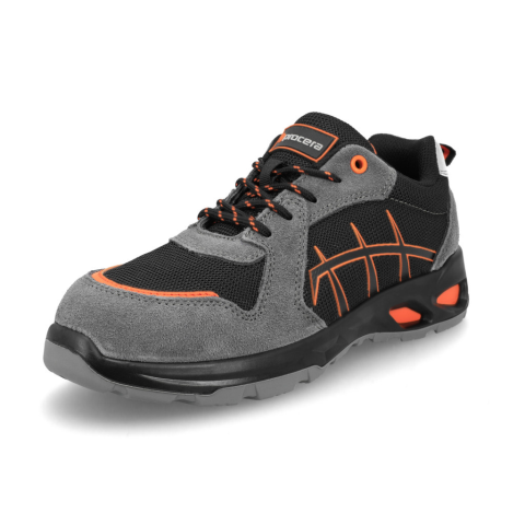 Védő félcipő TORRE S1 acél lábujjvédelemmel. A cipő felsőrésze velúrbőrből és tartós, légáteresztő textilanyagokból készült. Az orr- és sarokrész kiegészítő védőréteggel megerősítve. A csúszásgátló talp kétkomponensű PU/PU poliuretánból készült, antisztat