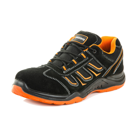 VENTI S1 biztonsági cipő - a lábbeli felsőrésze velúrbőrből és tartós és ellenálló légáteresztő textilanyagból készült betétek, amelyeknek köszönhetően a láb lélegzik. A kétsűrűségű PU/PU poliuretánból készült csúszásgátló talp, antisztatikus és olajálló