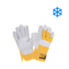 Bélelt, hasított marhabőr védőkesztyű, kézháton sárga farmer szövettel, gumírozott farmer mandzsettával. Tenyere színbőr, vastag, puha tenyérbéléssel, artéria, köröm és ökölcsontvédő. EN 388