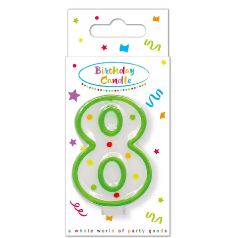 Készültök a nyolcadik szülinapra? Akkor ez a vidám és színes 8-as számú pöttyös szülinapi gyertya a tökéletes választás a tortára! A gyertya fehér alapját élénk színű pöttyök díszítik, amelyeket egy friss, zöld szegély foglal keretbe. Ez a dizájn nemcsak a gyerekeknek tetszik, de a dekorációval is könnyedén összehangolható, legyen szó állatos, szuperhősös vagy he