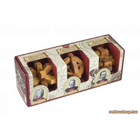 A fából készült fejtörők az alábbi híres tudósokhoz kapcsolódó formákat elevenítenek meg: Halley (üstökös), Galileo (gömb) és Kepler (csillagászati). A puzzle-k ravaszsága minden bizonnyal őket is rabul ejtené, de a kérdés itt az, hogy Téged sikerült-
