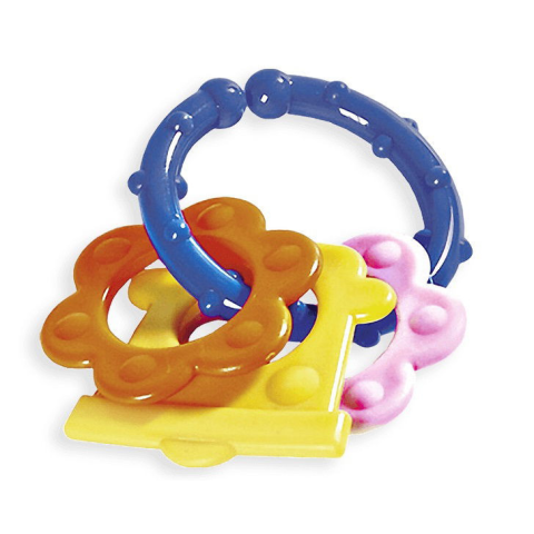 Gyűrű három fonott színes darabból a legkisebb gyermekek számára. A hangot adó játékok általában a legnépszerűbb gyermekek körében. A zümmögő hang megnyugtatja a gyermekeket, emellett a gyermek megtanulja érzékelni és feldolgozni a környező ingereket,