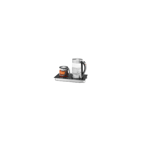 Vízforraló: Max. kapacitás 1,8 liter Egyszerű kezelhetőség a kábel nélküli kialakításnak köszönhetően - könnyen önthető és kiönthető 360 ° -os csatlakozó Zárható biztonsági zsanéros fedél Integrált mészszűrő Automatikus / kézi kikapcsolás Vízszint jelző Párolgás / túlmelegedés elleni védelem Be / Ki kapcsoló Üveg teáskanna: Tea- és kávéfőző Max. kapacitás 0,8 liter Hőálló üveg Kivehető rozsdamentes acél tea szűrő Bázis: Elektronikus meleg