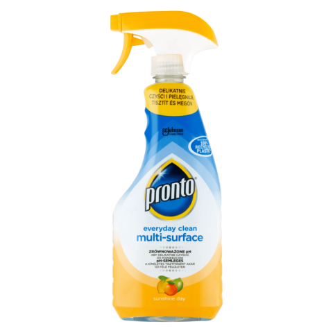 A flakon 100%-ban újrahasznosított műanyagból készült A Pronto Everyday Clean Multi-Surface általános felülettisztító spray semleges pH-értékű formuláját arra tervezték, hogy megbírkózzon a makacs foltokkal és szennyeződésekkel, de megfelelően kíméletes legyen mindennapi használat esetén is. Speciális formulája gyengéden eltávolítja a port és a sz