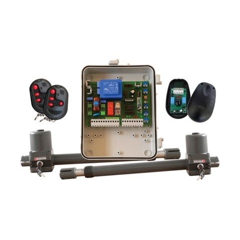 PROTECO orsós kapumozgató kit, GARDENGATE kiegészítőkkel kétszárnyas kapukhoz, 2db 230Vac Leader-4 motor, jobbos és balos, 400 mm löket, max 2,75m-es kapuszárnyakhoz, TWIST vezérlés beépített ugrókódos rádióvevővel, 2db 4 csatornás rádióadó MASTER ROUNDQ