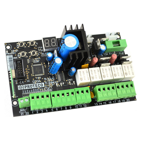 PROTECO Q20A Vezérlés, egy vagy kétszárnyú kapukhoz, 24V-os Vezérlés, egy vagy kétszárnyú kapukhoz, 24V-os, digitális kijelzővel, hiba visszajelző funkció, 12V-os zár csatlakoztatható gyors zárási funkció, egyedi biztonsági bemenetek 8k2 biztonsági k