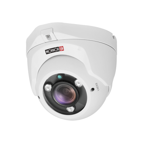 PROVISION-ISR Dome kamera, 5MP AHD Pro, 4in1 kültéri, inframegvilágítós, mechanikus Day&Night dome kamera, 1/2,7'' CMOS chip, 5MP (4:3) 2592×1944 felbontás AHD/TVI@20fps, 4MP (16:9) 2560x1440 felbontás AHD/TVI/CVI@25fps, CVBS + PAL/NTSC kimenet, 0,01lux/F1,0 (0lux 25m-en belül bekapcsolt infraLED-ekkel), 3db tömb LED, 2,8-12mm-es megapixeles manuális variófokusz objektív, látószög 91°-25°, progresziv letapogatás, OSD menü (csak CoC-on keresztül), CoC, BLC, ATW, 2D-