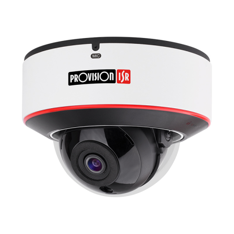 PROVISION-ISR IP Dome kamera, 5MP (2592X1520), 1/3” CMOS (16:9), Master Stream: 5MP (2592x1520) / 2K(2560x1440) / 3MP (2304x1296) / 2MP / 1MP, Sub-Stream: 1MP/QVGA/D1/CIF, Harmadik Stream: QVGA/D1/CIF (1~30fps), Bitrate: 64Kbps ~ 4Mbps@H.265 / 64Kbps ~ 6Mbps@H.264, VBR/CBR, H.265S/H.264S*, H.265+/H.264+/H.265/H.264/MJPEG tömörítés, Eye-Sight, 2.8mm (108°) fókusztávolság, 0.1lux fényérzékenység, 20m infra hatótávolság, 3db LED, Beépített mikrofon, 1 audio bemenet, 1 riaszt