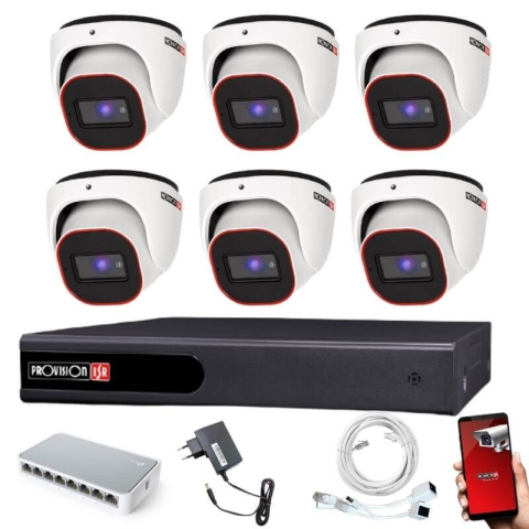 Provision 6 dome IP kamerás megfigyelő kamera rendszer 2 Megapixeles Provision 1 nagy tömb ledes szett: 6 dome biztonsági kamera FULL HD 1920x1080 felbontás fehér színű kültéri fémház, 8 csatornás 5 megapixeles NVR rögzítő, 10 méteres LAN kábel, 8+2