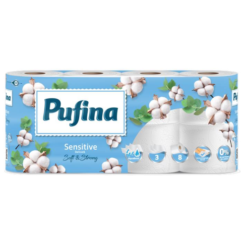 1 kép PUFINA Toalettpapír, 3 rétegű, kistekercses, 8 tekercs, "Sensitive Aquabond", illatmentes (KHH864) (KHH864)