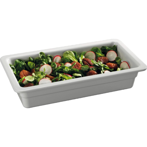 GN 1/3 melaminból készült gasztronádoba pala utánzatú felülettel. Tartósabb és kevesebb karbantartást igényel, mint az igazi pala. Mosogatógépben mosható. Éttermekbe, szállodákba és catering szolgáltatásokhoz alkalmas. Méretek: magasság 65 mm. Szín: fehér.