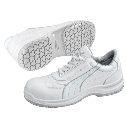 PUMA WHITE 'N SERVICE CLARITY LOW biztonsági cipőAz IQ.CELL technológia különlegessége: A PUMA WHITE 'N SERVICE termékcsaládja az IQ.CELL technológiával ellátott, amely egy közvetlenül a sarokrészbe ágyazott gélpárna. Ez trambulinként működik, elnyeli az ütéseket, majd visszapattanás formájában azonnal visszaadja az energiát.Főbb jellemzők:Kopásálló, rugalmas és könnyű külső talp: Speciális méhsejt szerkezetének köszönhetően elvezeti az állóf