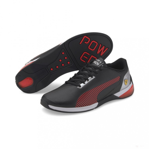 2021, Fekete színű Ferrari cipő 2021 új trendet hozott a Ferrari cipők világában mind megjelenésben, mind kényelemben. Ez a cipő is egyike a formai, illetve a kényelmi újdonságok közül. A domináns fekete szín mellett helyet kapott a fűző, illetve a sarok
