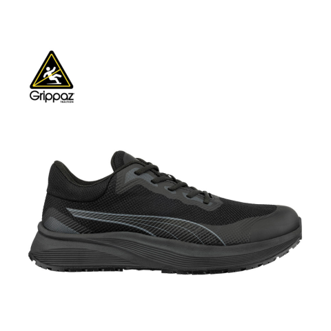 Puma Spark ST BLK Low O1 FO SR munkavédelmi cipő – A Puma Spark egy sportos, könnyű és kényelmes munkacipő, amely ideális a vendéglátásban dolgozók számára. A fémmentes konstrukció, a csillapító IMPULSE.LITE középtalp és a SPLASH GUARD membrán egész napos kényelmet biztosítanak. A futócipők ihlette, folyadékelvezető barázdákkal ellátott csúszásgátló talp kiváló tapadást nyújt, míg a légáteresztő hálós felsőrész FUSE.TEC megerősítéssel tartós