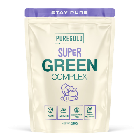 A PureGold Super Green Complex egy ízesítetlen italpor 13 féle gyümölcs- és zöldségporral, magas vastartalommal, valamint hozzáadott A- és C-vitaminnal, spirulinával a fáradtság és kimerültség csökkentésére. Vegán, zsírmentes, tartósítószer- és aszpartám-