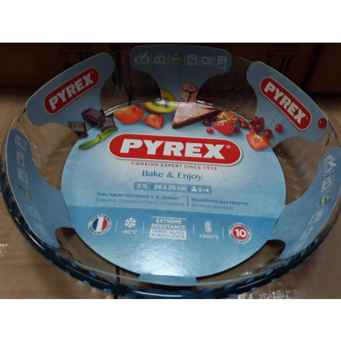 Pyrex kerek piteforma. Anyaga: edzett, hőálló üveg. Sütőbe, mikróba és fagyasztóba tehető, -40 °C és +300 ° C közötti hőmérsékleten használható. Mosogatógépben tisztítható. Átmérője: 26 cm, magassága: 5,8 cm, űrtartalma: 2,1 liter. Francia termék.