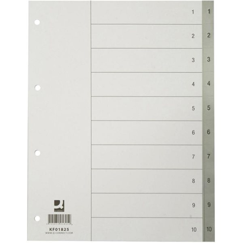 Regiszter - numerikusan rendszerező, lapok száma: 10, anyaga: polipropilén, 225 mm széles, 297 mm magas A Q-CONNECT regiszter nagyszerű áttekintést nyújt a dokumentumaidról vagy mappáidról. Kiváló minőségű polipropilénből készült, A4-es formátumban. 10 darab, 1-10-ig számozott lapot tartalmaz, a