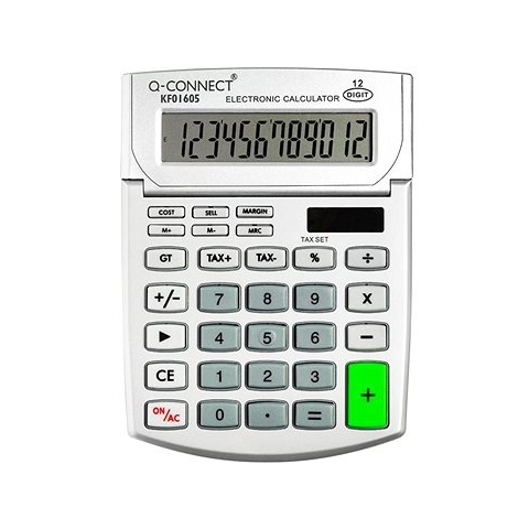 Q-CONNECT 12 számjegyű, dönthető kijelző, 4 funkciós memória, alapműveletes számolófunkció, bevétel-kiadás-nyereség számoló funkció, elem + napelem, méret: 102 x 140 mm.
