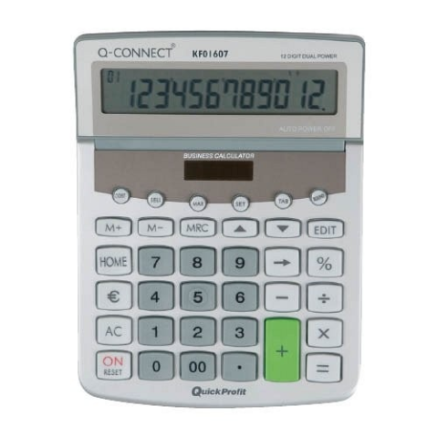 Q-CONNECT 12 számjegyű, állítható kijelzős asztali számológép. Napelem + 1 x GP189 (LR11300 akkumulátor). Háromgombos memória funkció. TAX (adószámítási) funkció. Euro, költség, haszon, árrés számítás. Mérete: 201 x 150 x 37 mm.