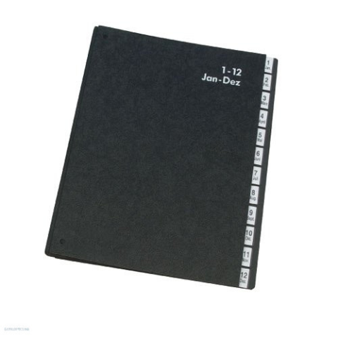 Előrendező a rendszerezett iratok gyűjtésére, 12 füllel (januártól decemberig). A4 méretű, kemény karton borítású, nem sima felületű rendezőkönyv rugalmas gerinccel. Az egy oldalon nyomtatott elválasztó lapokon a műanyag felületű számozás és betűjelek jó
