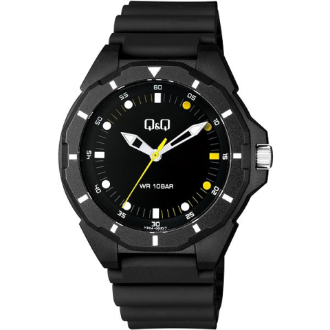 Karóra férfiaknak - analóg idő megjelenítés, óramű típusa quartz, kerek számlap, fényvisszaverő elemek, sportos, arab indexek, műanyag számlap, 100 m (10 ATM) vízhatlanság, a tok anyaga műanyag, a tok színe fekete, a szíj anyaga műanyag, a szíj színe fekete, 20 cm max. csuklóméretre, cserélhető szíjjal A nagyszerű Q&Q Mens V30A-003VY férfiaknak karóra jó szolgálatot tesz a mindennapokban. Az alapját egy 43 mm-es kerek számlap képezi. A hatékony Quartz technol