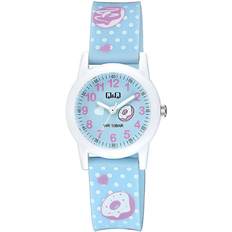 Karóra gyerekeknek - analóg idő megjelenítés, óramű típusa quartz, kerek számlap, 12/24 órás formátum, Q&Q sorozat, műanyag számlap, 100 m (10 ATM) vízhatlanság, a tok anyaga műanyag, a tok színe fehér, a szíj anyaga műanyag, a szíj színe kék, 18 cm max. csuklóméretre, cserélhető szíjjal A minőségi Q&Q V22A-002VY gyerekeknek karóra remek választás a mindennapkora. Az alapját egy 30 mm átmérőjű kerek számlap alkotja. Az effektív Quartz technológia hosszú