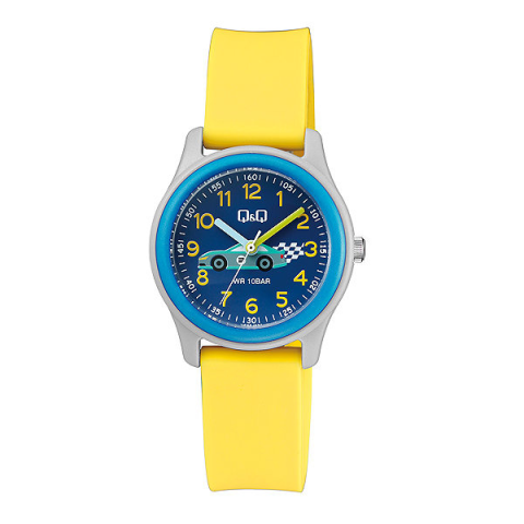 Karóra gyerekeknek - analóg idő megjelenítés, óramű típusa quartz, kerek számlap, 12/24 órás formátum, Q&Q sorozat, műanyag számlap, 100 m (10 ATM) vízhatlanság, a tok anyaga műanyag, a tok színe szürke és kék, a szíj anyaga műanyag, a szíj színe sárga, cserélhető szíjjal A nagyszerű Q&Q VS59J007Y gyerekeknek karóra remek választás a mindennapkora. Az alapját egy 32 mm átmérőjű kerek számlap alkotja. A Quartz technológia pontos időmérést és hosszú él