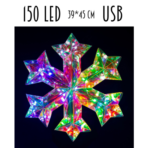 A Karácsonyi irizáló LED hópehely 39x45 cm-es méretben, holografikus felülettel készül, amely színes fényhatásokat biztosít. A dekoráció műanyagból készült, így könnyű, mindössze 0,25 kg tömegű. A termék USB kábellel érkezik, amely lehetővé teszi a LED vi