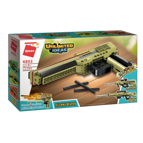 Qman 3 az 1-ben építőjáték készlet amelyből 3 különböző fegyvert építhetünk össze: pisztolyt, gépfegyvert vagy távcsöves puskát. A készlethez 3 töltény is tartozik. A készlet 202 építőelemet tartalmaz.