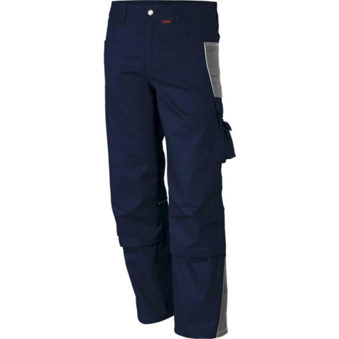 Derékrész 7 bújtató pánttal. Bedolgozott gumírozás a derékrész oldalain.Kalapácstartó. Slicc fém cipzárral. Előformázott térd és tépőzáras térdzseb. Elasztikus sztreccsbetét a térdzseb alatt. Jól láthatósági szegélyek az elülső kontrasztszínű részeken, a hátsó térdvarrásnál és a háton.