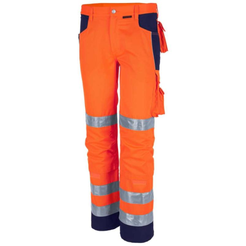 Derékrész 7 bújtató pánttal. Bedolgozott gumírozás a derékrész oldalain.Kalapácstartó. Slicc fém cipzárral. Előformázott térd és tépőzáras térdzseb. Elasztikus sztreccsbetét a térdzseb alatt. Jól láthatósági szegélyek az elülső kontrasztszínű részeken, a hátsó térdvarrásnál és a háton.