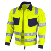 Gallér. Elöl rejtett műanyag cipzárral. Tépőzáras kézelő. Hosszított hátrész. Mozgást elősegítő hátszűkítő. Jól láthatósági szegély a mell- és hátfeltéten.