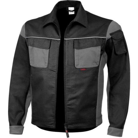 Gallér. Elöl rejtett műanyag cipzárral. Tépőzáras kézelő. Hosszított hátrész. Mozgást elősegítő hátszűkítő. Jól láthatósági szegély a mell- és hátfeltéten.