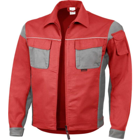 Gallér. Elöl rejtett műanyag cipzárral. Tépőzáras kézelő. Hosszított hátrész. Mozgást elősegítő hátszűkítő. Jól láthatósági szegély a mell- és hátfeltéten.