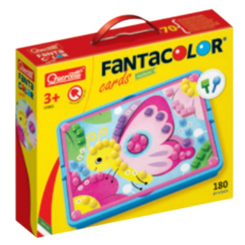 A Quercetti Fanta Color Cards játékszett már akár három éves kortól remek játékélményt nyújt a gyerekeknek. A szettben található táblára helyezhetők a különböző, természet vidám színeivel és mintáival ellátott kártyák, amiket aztán a megfelelő részeken dekorálni lehet a készletben található színes pötyikkel. A készlet összesen 130db-o