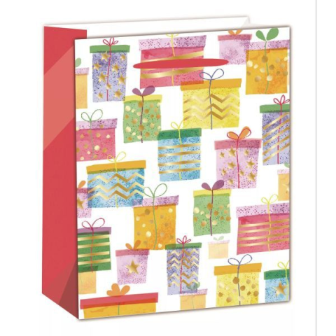 Ajándékcsomagokat ábrázoló ajándékzacskó szalagfüllel, hogy az ünnep még boldogabb, vidámabb és édesebb legyen az ünnep. Praktikus, többször felhasználható, ezért kevésbé károsítja a környezetet, mint a hagyományos csomagolópapír.Anyaga: Papír/műanyagA termék mérete: 18 x 23 cm
