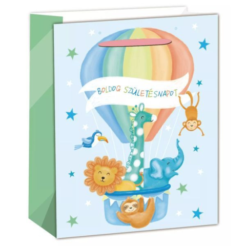 Állatok hőlégballonnal ajándékzacskó szalagfüllel, hogy az ünnep még boldogabb, vidámabb és édesebb legyen az ünnep. Praktikus, többször felhasználható, ezért kevésbé károsítja a környezetet, mint a hagyományos csomagolópapír.Anyaga: Papír/műanyagA termék mérete: 18 x 23 cm