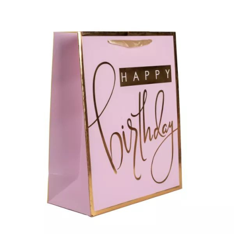 Elegáns, Happy Birthday feliratot ábrázoló ajándékzacskó szalagfüllel, hogy a szülinapos még vidámabb legyen. Praktikus, többször felhasználható, ezért kevésbé károsítja a környezetet, mint a hagyományos csomagolópapír. Anyaga: Papír/műanyagA termék mérete: 18 X 23 cm