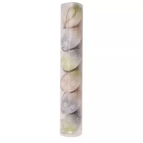 Aranyos dekortojások, amik elengedhetetlen kiegészítői a húsvéti dekorációnak. A tojások könnyen felakaszthatók a rajtuk található zsinórral.A termék jellemzői:- Színátmenetes mintázat- 6 cm-es méret- 6 db-os szett- Könnyen felakasztható kivitel- Ideális ünnepi dekorációhozCsomagolás mérete: 4 x 6 x 4 cm