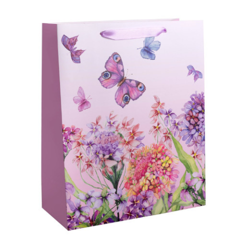 Dísztasak matt 26x32 cm lila lepke és virág - P0090-6049 - Ajándék csomagolók, díszzacskók -