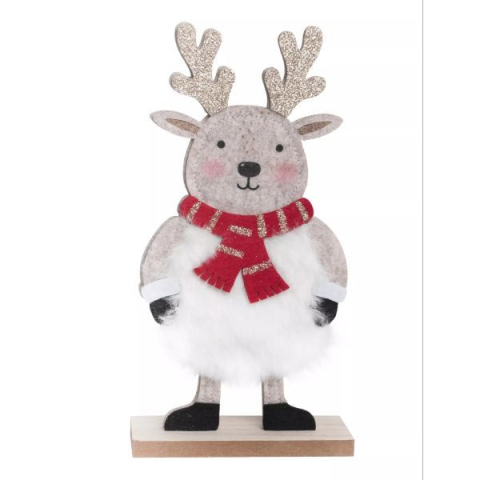 Ez a kedves filc rénszarvas egy talapzaton áll, és tökéletes kiegészítője az ünnepi dekorációnak. Vidám megjelenése és részletgazdag kidolgozása melegséget varázsol bármelyik helyiségbe.A termék jellemzői:- Minőségi filc anyagból készült- Stabil fa talapzat- Ünnepi piros sálMérete: 5 x 23 cm